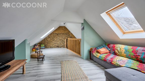 - Une mezzanine avec un canapé et TV