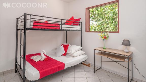 - Chambre 3 : avec un lit superposé (un lit simple en hauteur et un lit double en bas)