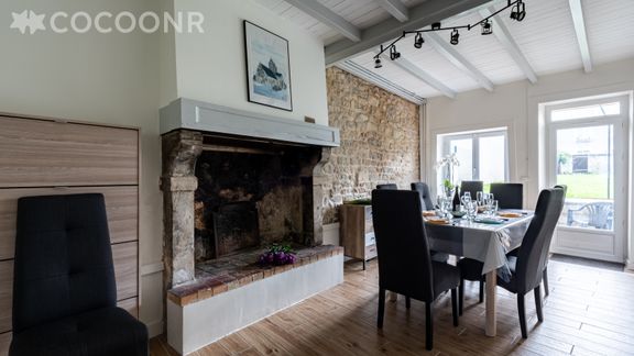 - Une salle à manger pouvant accueillir 6 convives avec une cheminée et un accès au jardin.