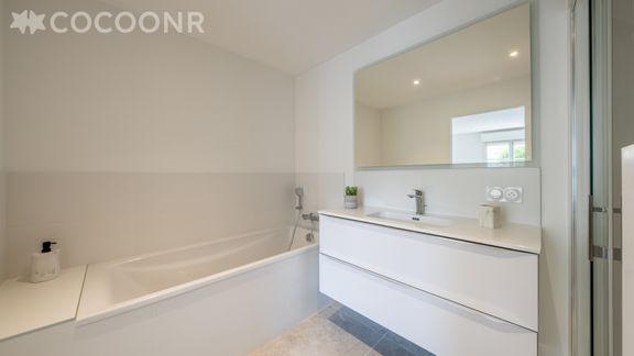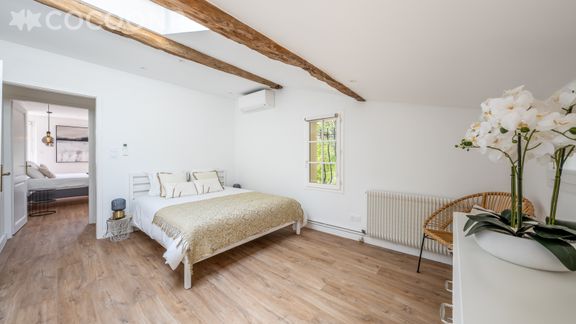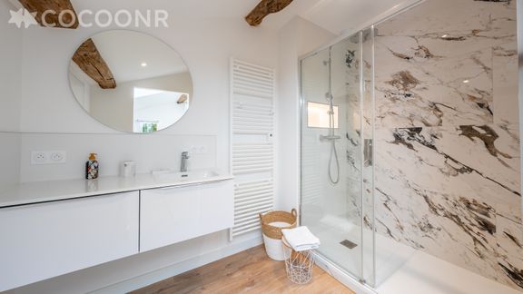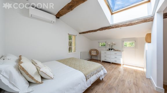 - Chambre 1 : spacieuse et lumineuse avec un lit king-size (180×200), elle bénéficie d'une salle de bain attenante avec douche à l'italienne, baignoire, lavabo et WC.