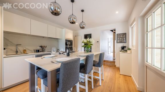 - Une cuisine ouverte équipée pensée pour les moments partagés avec notamment : bouilloire électrique, four, four à micro-ondes, grille-pain, lave-vaisselle, plaques de cuisson.... Son grand îlot central en fait un véritable cœur de vie, parfait pour cuisiner, discuter ou prendre l’apéritif.
