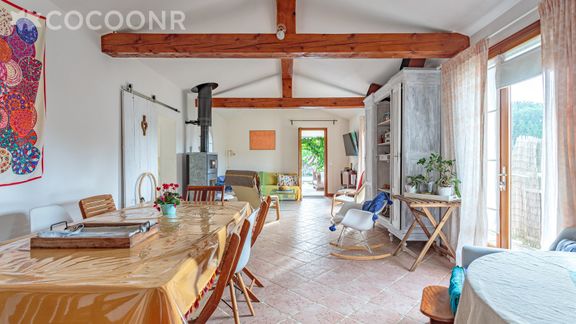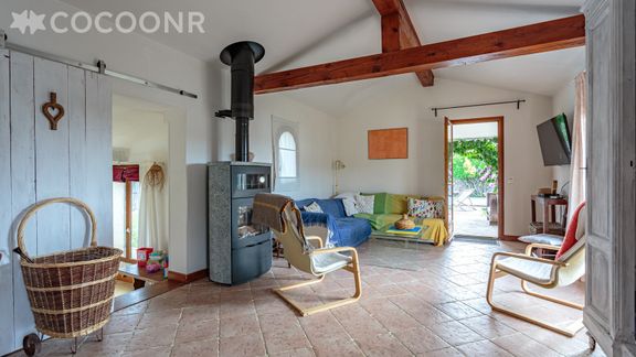 - Une pièce de vie de 40 m² avec canapé-lit, TV, coin repas et cheminée (bois fourni)