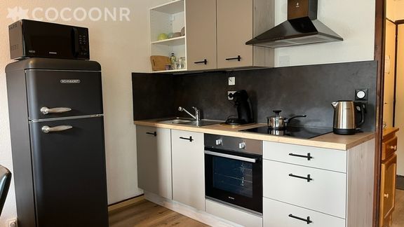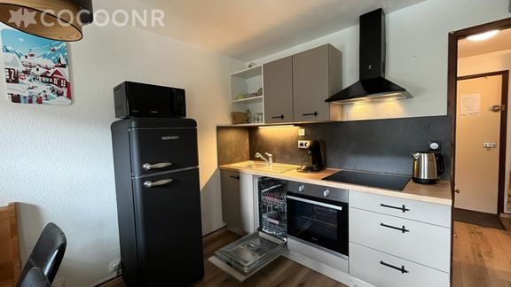 - Une cuisine équipée avec notamment : cafetière Senseo, bouilloire électrique, four et micro-ondes, plaques de cuisson à induction, lave-vaisselle...
