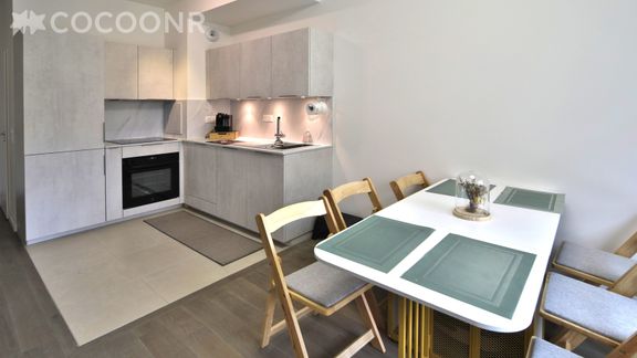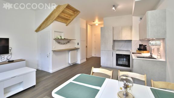 - Une cuisine équipée avec notamment : bouilloire électrique, four, four à micro-ondes, grille-pain, lave-vaisselle, plaques de cuisson...