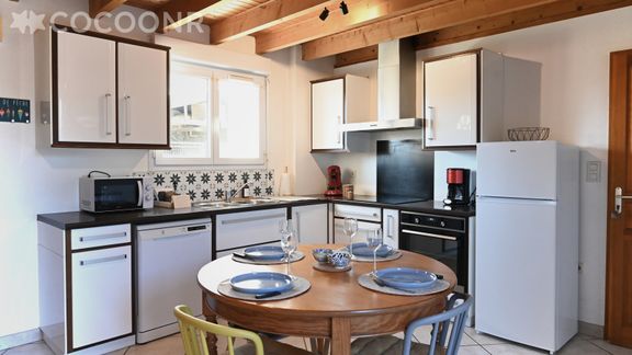- Une cuisine équipée avec notamment : bouilloire électrique, four, four à micro-ondes, grille-pain, lave-vaisselle, plaques de cuisson et son espace repas
