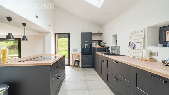 - Une cuisine équipée avec notamment : bouilloire électrique, four, four à micro-ondes, grille-pain, lave-vaisselle, plaques de cuisson...