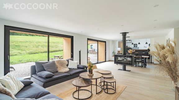 - Une pièce de vie de 60 m² avec TV, canapés, cheminée (bois fourni en supplément)