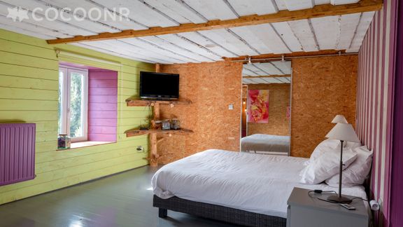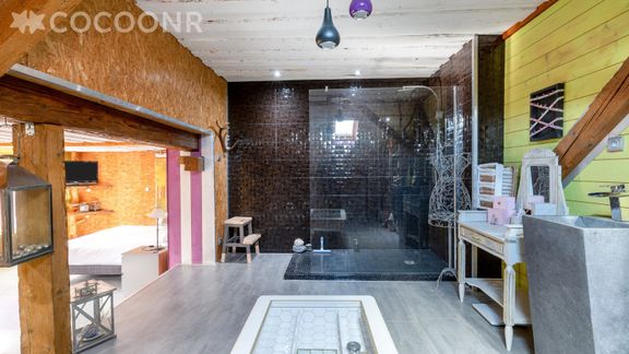 - Une pièce de vie de 100 m² avec TV, banquettes, coin repas et cheminée.