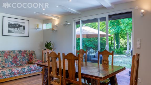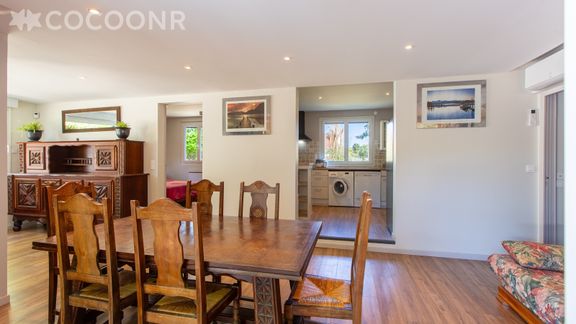 - Séjour lumineux de 35 m² avec canapé, espace repas, jeux de société, livres, TV connectée