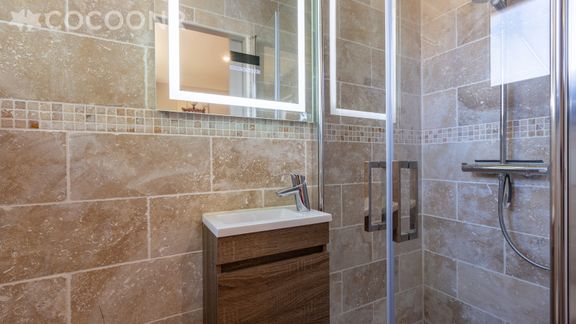 - Chambre 1 : lit double électrique (140x190), TV connectée, salle d'eau privative avec douche et WC