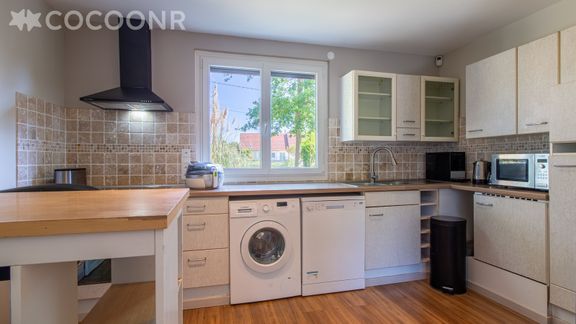 - Cuisine ouverte équipée : four, micro-ondes, plaques, lave-vaisselle, cafetière, grille-pain, réfrigérateur, ustensiles et vaisselle pour 6 personnes