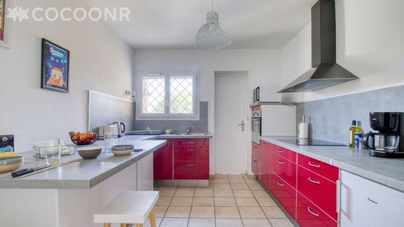 - Une cuisine équipée avec notamment : bouilloire électrique, four, four à micro-ondes, grille-pain, lave-vaisselle, plaques de cuisson... et une arrière cuisine avec accès piscine