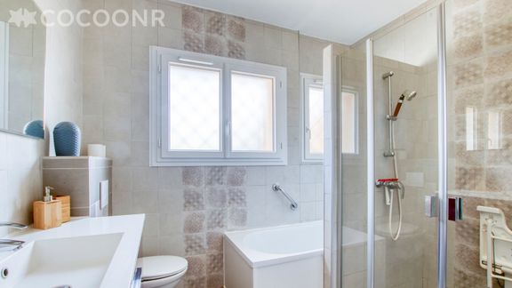 - Une salle de bain avec douche et baignoire, meuble vasque et WC