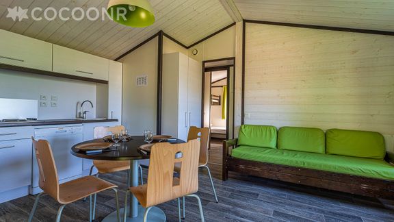 - Une pièce de vie de 15 m² avec TV, canapé-lit, coin repas et cuisine ouverte équipée avec notamment : bouilloire électrique, four à micro-ondes, grille-pain, lave-vaisselle, plaques de cuisson...