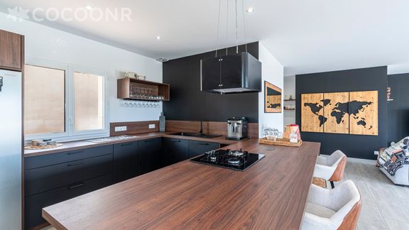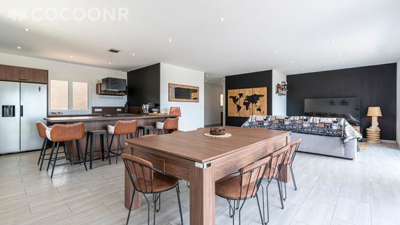 - Une pièce de vie de 54 m² avec TV, canapé-lit double, espace repas et cuisine ouverte équipée avec notamment : bouilloire électrique, four, four à micro-ondes, grille-pain, lave-vaisselle, plaques de cuisson...