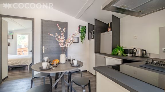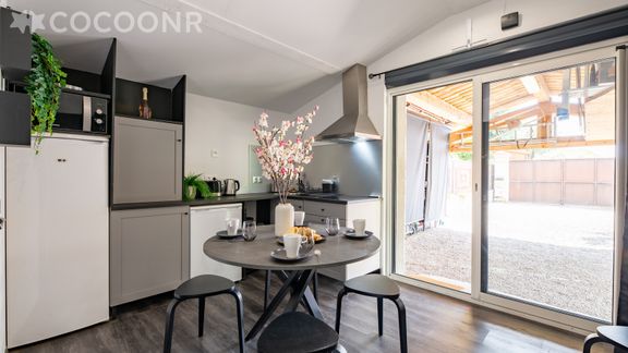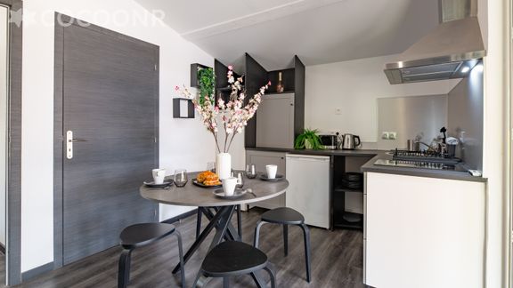 - Une pièce de vie de 20 m², cuisine équipée avec notamment : bouilloire électrique, four à micro-ondes, grille-pain, plaques de cuisson...