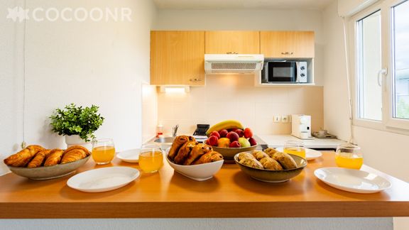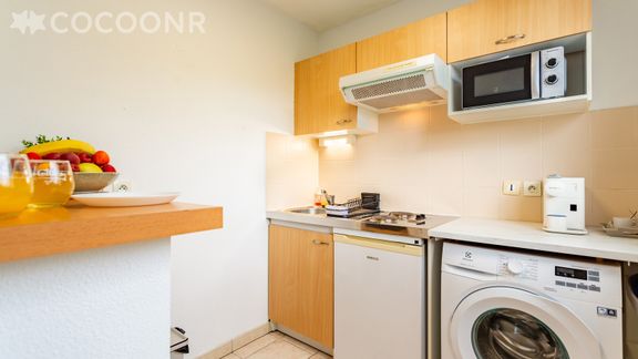 - Une kitchenette équipée avec notamment : bouilloire électrique, four à micro-ondes, grille-pain... et espace repas