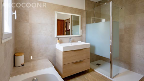 - Une salle de bain avec douche et baignoire