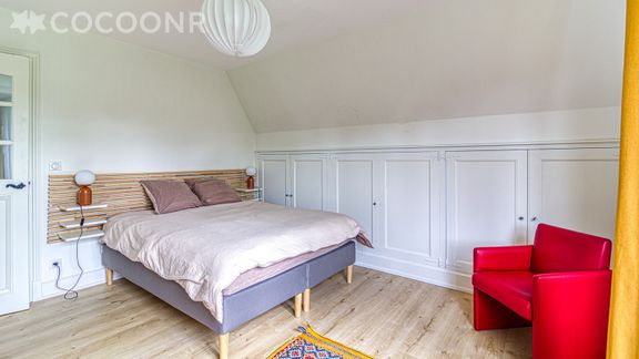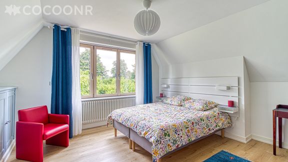 - Chambre 1 : avec un lit king-size (180×200) convertible en deux lits jumeaux (90×200) et un coin bureau