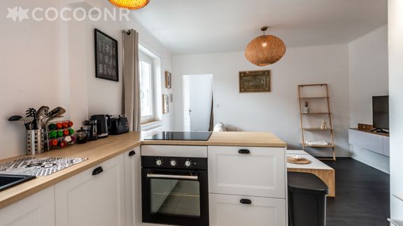 - Une cuisine ouverte équipée avec notamment : bouilloire électrique, four, grille-pain, lave-vaisselle, plaques de cuisson...