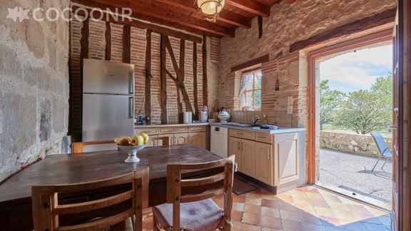 - Un coin repas avec une kitchenette équipée, une table et des chaises