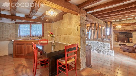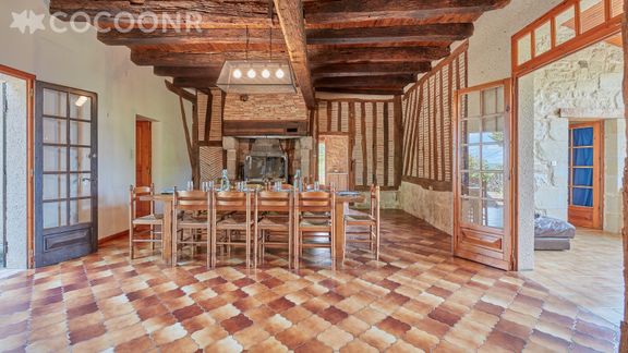 - Une pièce de vie de 80 m² avec canapé, TV, cheminée (bois fourni) et coin repas pour 10 personnes