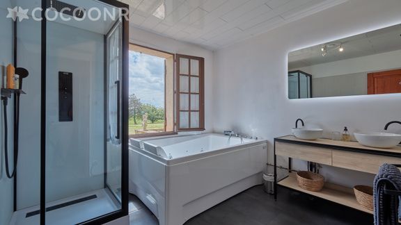 - Une salle de bain avec une baignoire balnéo pour 2 personnes et une douche