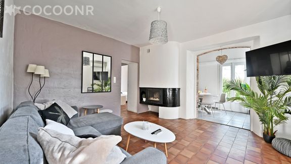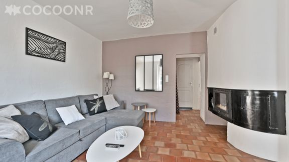 - Une pièce de vie de 25 m² avec TV, canapé, cheminée (bois non fourni).