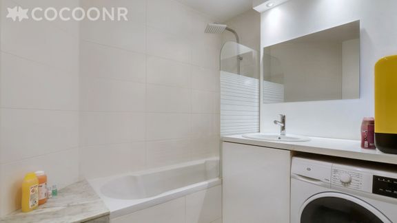 - Une salle de bain avec baignoire, lavabo, lave-linge