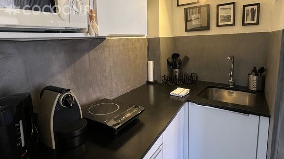 - Une cuisine équipée avec notamment : bouilloire électrique, grille-pain, plaques de cuisson, réfrigérateur, four à micro-ondes, cafetière…