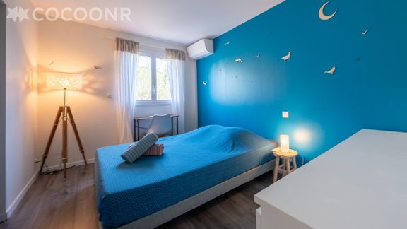 - Une chambre avec un lit queen-size (160×200), un bureau idéal pour télétravailler, une salle de bain avec baignoire pour des moments de relaxation, et un WC séparé.