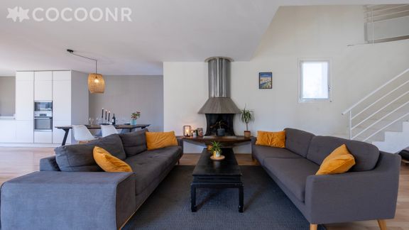 - Avec son salon cozy (TV, canapés) et sa cuisine moderne ouverte équipée d’un îlot central, cet espace invite aux moments de partage, que ce soit pour un dîner entre amis ou une soirée détente après une journée de travail.