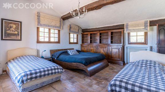 - Chambre 4 : un lit queen size (160×200) et 2 lits simples, une salle de bain attenante avec WC et une terrasse avec mobilier