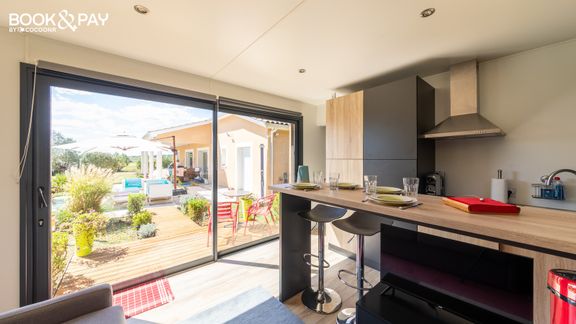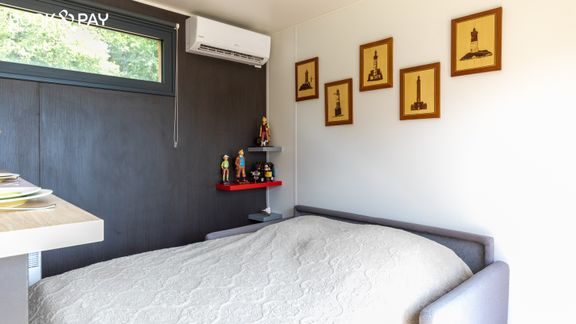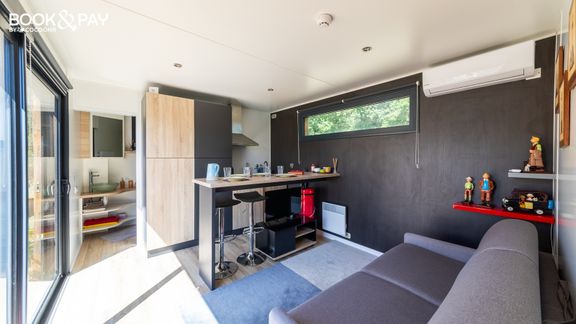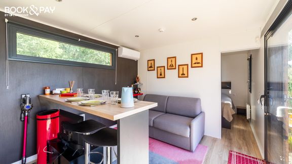 - Une pièce de vie de 14 m² avec TV, canapé-lit double et espace repas