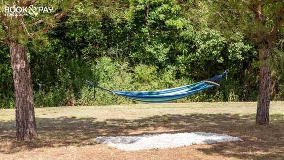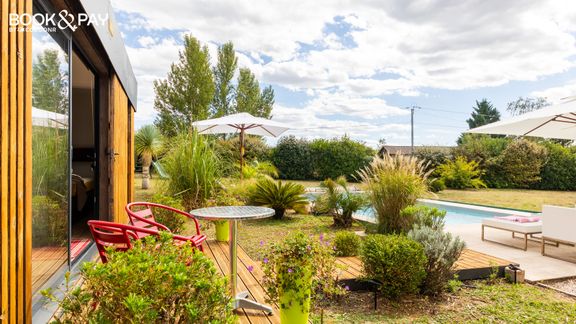 - Une terrasse en bois de 12 m² sur un terrain partagé 6 000 m² avec salon de jardin, lit de bain et parasol pour profiter des beaux jours. Elle est également équipée de deux prises extérieures.