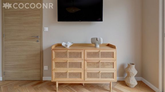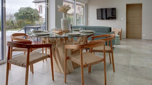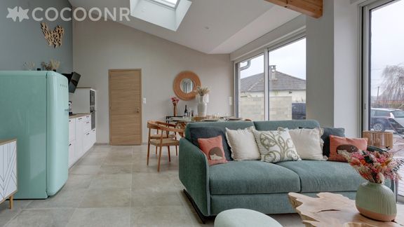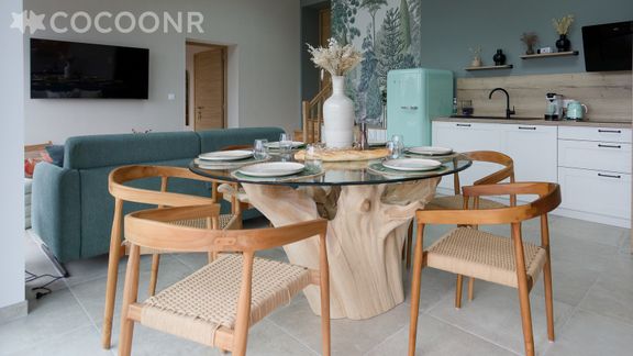 - Une pièce de vie de 30 m² avec TV, canapé et un espace repas