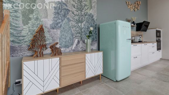 - Une cuisine équipée avec notamment : bouilloire électrique, four, four à micro-ondes, grille-pain, lave-vaisselle, plaques de cuisson...