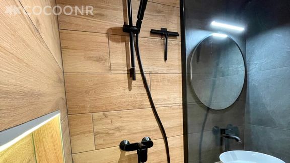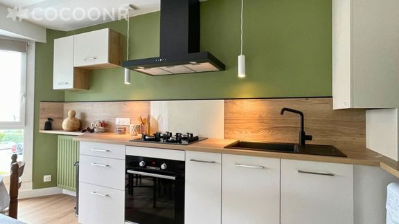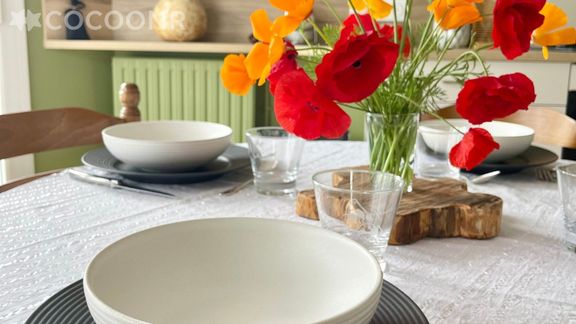 - Une cuisine équipée avec notamment : four à micro-ondes, four, hotte, plaques de cuisson, machine à café à filtre, grille pain, bouilloire...