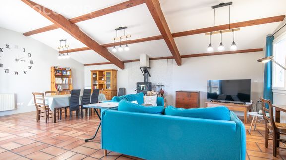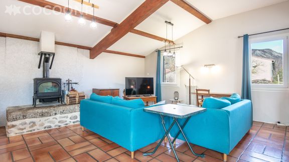 - Une pièce de vie de 30 m² avec canapé-lit double, TV, coin repas et poêle à bois (bois fourni)