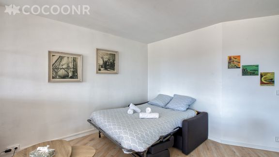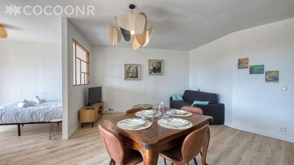 - Une pièce de vie de 25 m² avec TV, canapé-lit double, espace repas