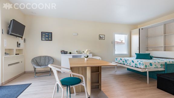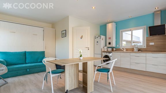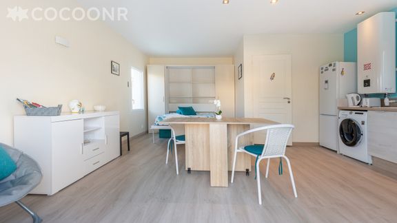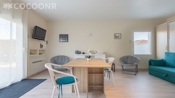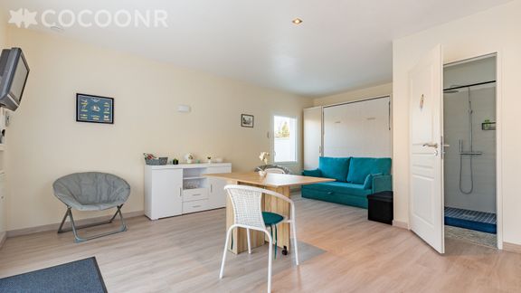 - Pièce de vie aménagée avec lit double escamotable, laissant place à un canapé lorsqu'il n'est pas déplié, TV, espace repas pour 2 convives.