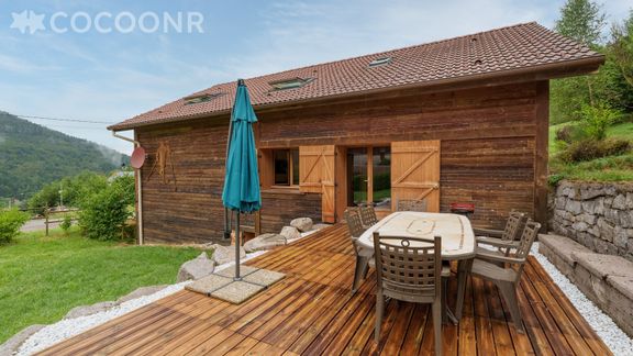 - La terrasse, adjacente à la cuisine, s'étend sur 25 m² et bénéficie d'une exposition plein sud, offrant une vue sur les pistes de ski de Ventron. Elle est équipée d'une table, de chaises, de chaises longues, de deux parasols, et d'un barbecue.