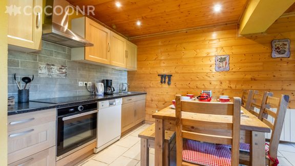 - Une cuisine ouverte équipée avec notamment : bouilloire électrique, four, four à micro-ondes, grille-pain, lave-vaisselle, plaques de cuisson, machine à café à filtre...