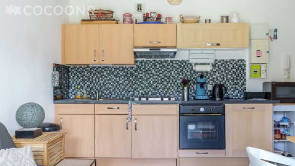 - Une cuisine ouverte équipée avec notamment : bouilloire électrique, four, four à micro-ondes, grille-pain, plaques de cuisson...