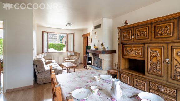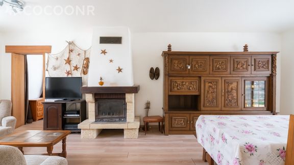 - Une pièce de vie de 25 m² avec canapé, TV, cheminée (non fonctionnelle) et espace repas