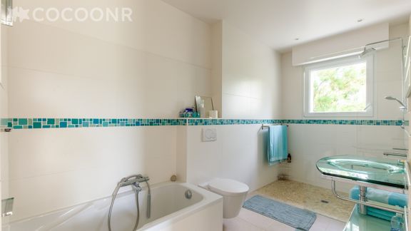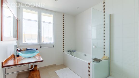 - Suite parentale : Un lit queen-size avec une salle de bain (avec baignoire) attenante et un salon-bureau.