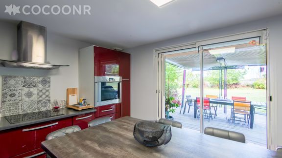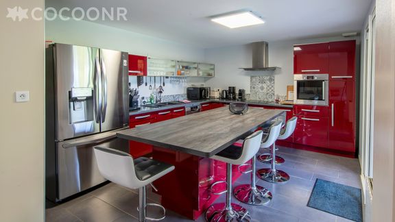- Une cuisine avec îlot central et coin repas, ouverte sur le séjour, équipée avec notamment : bouilloire électrique, four, four à micro-ondes, grille-pain, lave-vaisselle, plaques de cuisson...