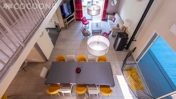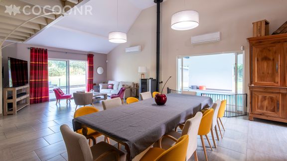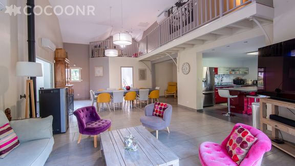 - Une pièce de vie de 50 m² avec TV, canapé, fauteuils et grande table à manger