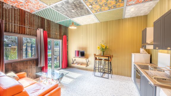- Une pièce de vie avec TV, un coin salon et un coin repas