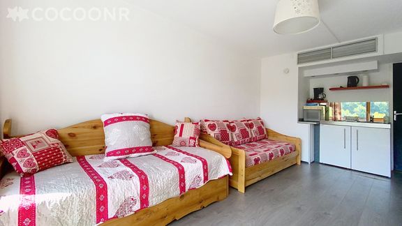 - Une pièce de vie de 16 m² avec TV, un lit gigogne (2 couchages) et un canapé-lit double